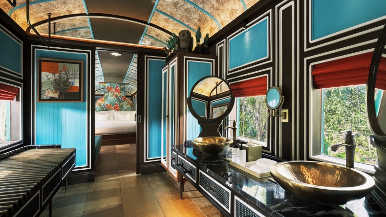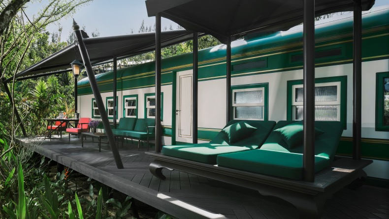 传奇酒店设计师Bill Bensley最新座作品——泰国考艾洲际酒店,在泰国最古老的国家公园中开业。他创作了一个属于19世纪东南亚的奇幻故事,将废弃的火车变身豪华酒店客房,重现19世纪的火车旅行时光。