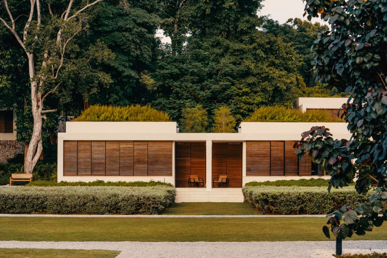 42间宽敞的套房、2间豪华的两居室套房和1间独栋的4居室别墅可供您选择,所有套房均配有私人游泳池、宽敞的室内外空间以及豪华的浴室。建筑大量运用对称,象征着和谐、仪式感;还有干净利落的垂直线条,贯穿室内外的游廊、莲池等。此外还运用了大量的白墙,除了可以扩大宅院内部的空间感,还一边进行着标志性的、微妙的“光影游戏”。此外,约有50套私人住宅可供购买,可以说是真正意义上的“海景”别墅了。