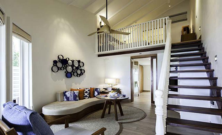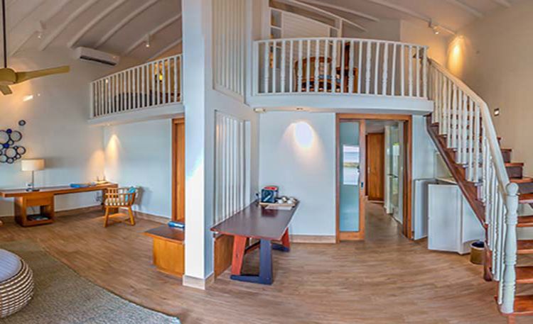 18间高级水上别墅每间可以同时入住3个成人或者是2个成人和一个小孩。共87平方米的居住空间,提供一个大床(或者2个单人床)卧室,以及独立区域的客厅,洗手间配有个人的按摩浴缸和花洒淋浴系统。可以升级为岛屿俱乐部和享用岛屿俱乐部专有设施。