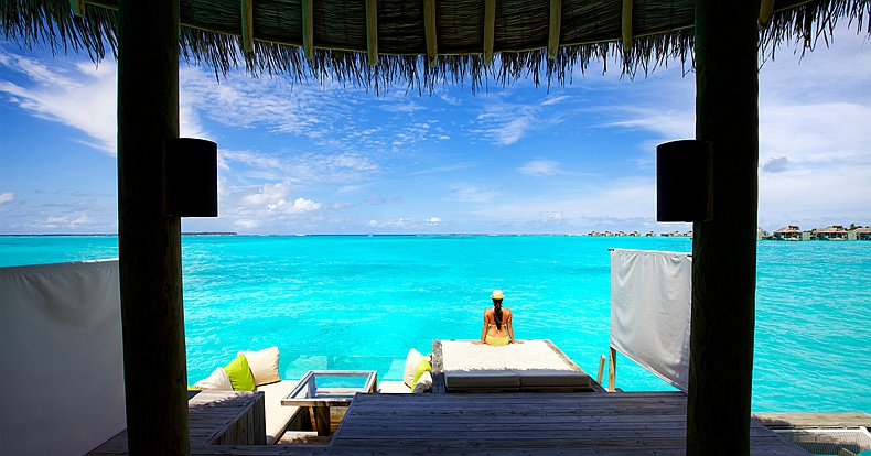 拥有内嵌式的玻璃浴缸,私人水上花园,房间共2层,外带两个露天阳台,位置位于水屋栈桥的中间。额外有4间带泳池的海景水上别墅可供选择。