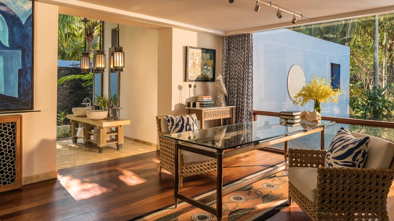 从私人水疗间中浪漫的情侣护理,到海滨露天平台上梦幻的私人晚餐,更可享受别墅内的床边早餐,在跌水泳池啜品鸡尾酒,牵手漫步在近在咫尺的沙滩上。这些独栋单卧室精美别墅配有露天平台,几步之外便是波光粼粼的海面和白沙海滩,是渴望完美沙滩假期的情侣的理想选择。当地独特的艺术品、精心挑选的工艺品和摆满书籍的书架 — 每间别墅都采用比尔·本斯利 (Bill Bensley) 全新的蓝色调设计,配有宽敞的学习区和配备漩涡浴池的私人室外跌水泳池,还有沙滩吊床、带躺椅的凉亭和下沉式室外沐浴间。