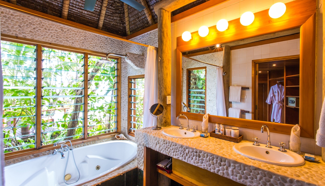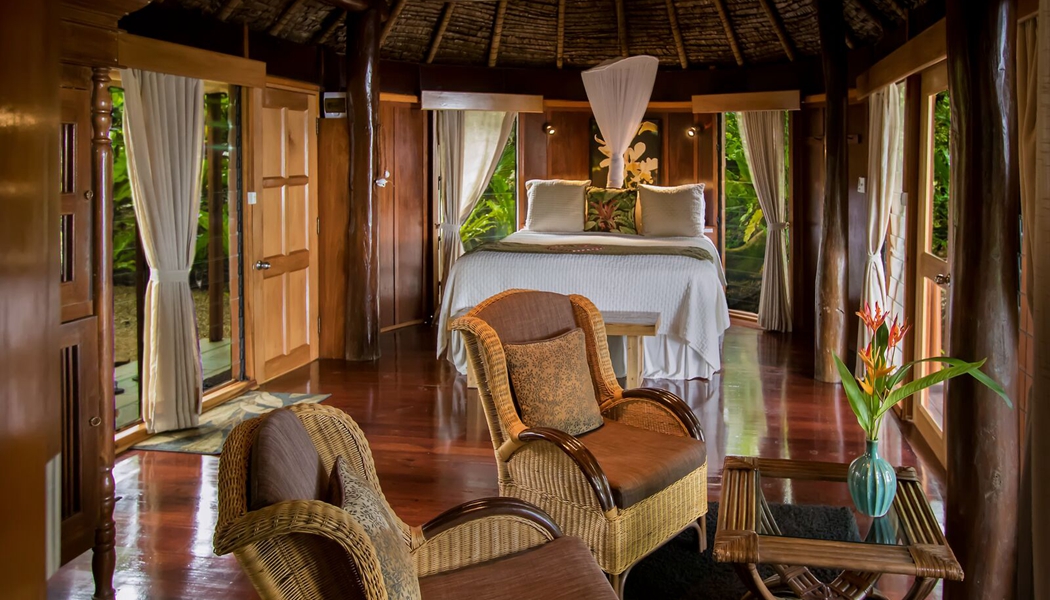草屋配备:拥有精品设备的淋浴间、室内按摩浴缸、Mini Bar、茶饮/咖啡/点心、Pure Fiji淋浴用品、吹风机、浴袍、化妆镜、CD播放器,客人可以选择一张超大四柱床或者两张单人床。