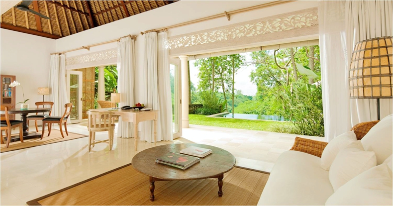 与 Uma Suite 相若,这种套房拥有宽敞的起居和用餐空间,以及舒适的卧室,卧室内有一张垂着白色纱幔的四柱床。私人无边瀑布池拥揽巴厘岛丛林的美景。