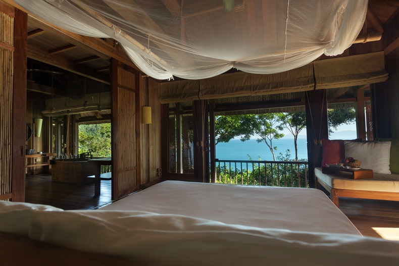 位于私人海湾的海边岩石构造上,壮丽的亭楼群西面为日落景观。进入别墅须通过山边的木质私人栈道 — 从主餐厅和酒吧步行 20 分钟即可到达,也可乘坐私人小艇。私人戏水池自然融入天际线和周围环境。另外通过木质台阶,也可直达海中。独立的亭楼内设起居区、餐厅、水疗室以及主卧室,靠近套内浴室,内设手工浴缸和蒸汽淋浴。专职管家 24 小时服务。