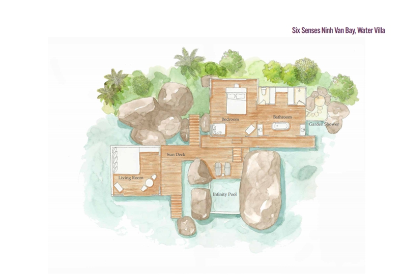 岩石泳池别墅被越南东海宁静的海水环绕,散布在宁凡湾西端的岩石构造上,距离度假酒店的繁华区域较远,环境特别幽静。每栋别墅都有嵌入岩石的私人戏水池。别墅的睡眠区和起居区相互独立,设计高雅而宽敞,包含套内浴室、步入式衣橱、独立盥洗区和手工浴缸。别墅可通过观光栈道到达,远离其它别墅,从而保证绝对的私密性。