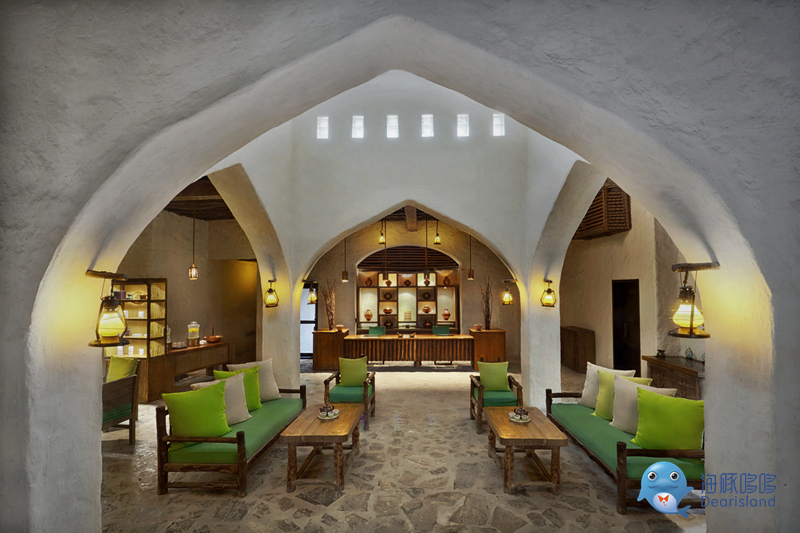 酒店建筑全部采用天然石材和木材搭建,传统的阿曼洞穴式避暑结构,高大的吊顶,颜色明快的装饰。82间豪华泳池别墅形成了一个阿曼小村庄。