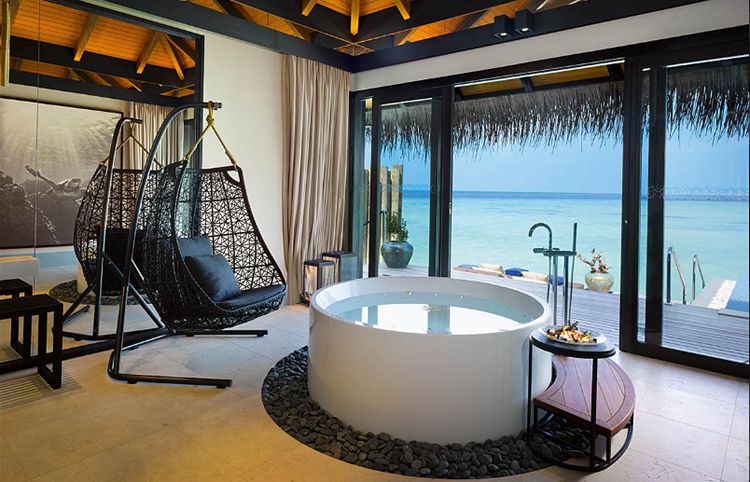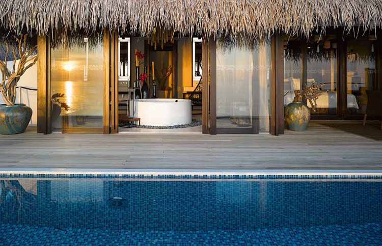 别墅沿着一处长长的码头依次排开,呈美丽的月牙状,可览尽印度洋和私人泳池的旖旎风光。屋顶垂下的茅草为用餐区洒下一片阴凉,卧室和浴室连着露台、泳池和阳光甲板,更有直接通往诱人海中的阶梯。别墅内部,舒适怡人的起居室装有落地观景窗,床铺正对着壮观无垠的印度洋。