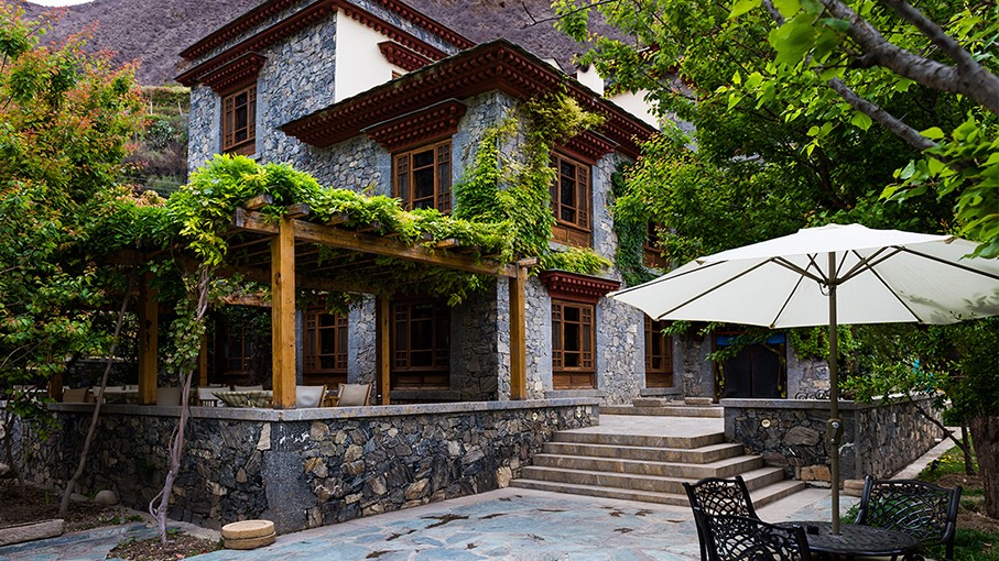 酒店被纯正的有白色围墙的藏族住宅建筑所包围,标志性的石砌藏式小楼与木顶白墙的农舍相得益彰,从山居可眺望对面小山顶上的经堂。