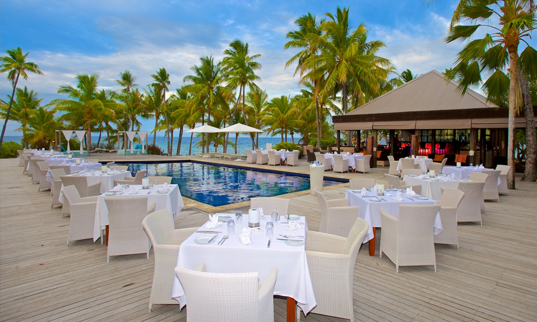 礁石餐厅是酒店的主餐厅,提供点餐服务。每天的午晚餐都可在海边或树下享受,晚间会有斐济本土音乐或世界流行音乐演奏。 可以为有特殊需求的成人或儿童提供专门设计的菜单。每周四晚上也在此举办免费的鸡尾酒之夜,佐以斐济传统的舞蹈表演以及斐济主题自助餐。