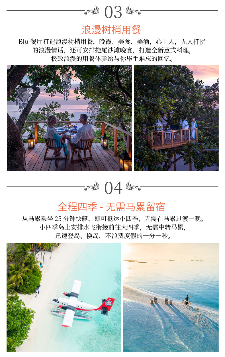 【哆哆推荐】如遇晚班机离开马代,可付费升级水飞回小四季,在小四季享用晚餐后,再根据航班时间快艇送往马累,享受更多岛上时光。