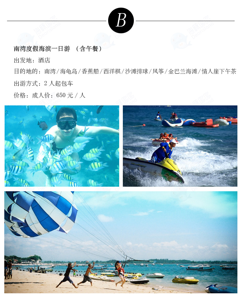 全天自由活动,自由享受酒店的各项设施、【哆哆推荐玩法】别急着往外跑,入住了巴厘岛最大的酒店,自然是要好好的享受一下酒店的各种美好。万国自助餐厅肯定是不能错过的,人均消费也才三张毛爷爷不到,怎能错过!努沙度瓦的沙滩,怎能不用来好好的感受来自南纬八度的阳光?