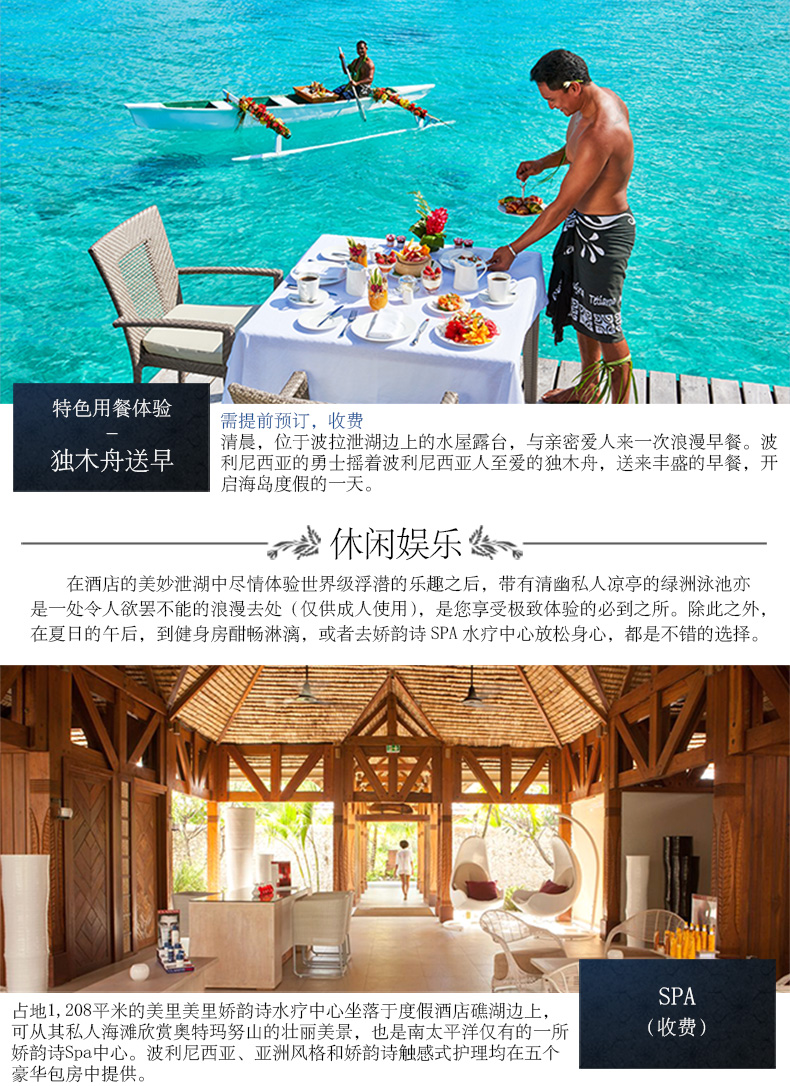 ●三晚波拉波拉瑞吉酒店超级水上屋●两晚白兰度私人岛单卧室别墅●一晚大溪地主岛洲际酒店日用房●五晚城市税金