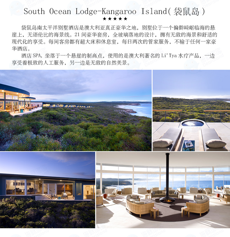 悉尼两晚国际五星ParkHyatt同级双床房; 袋鼠岛两晚4星KangarooIslandSeafront或同级海景房; 阿德莱德两晚5星MayfairHotel酒店或同级标准双床房;