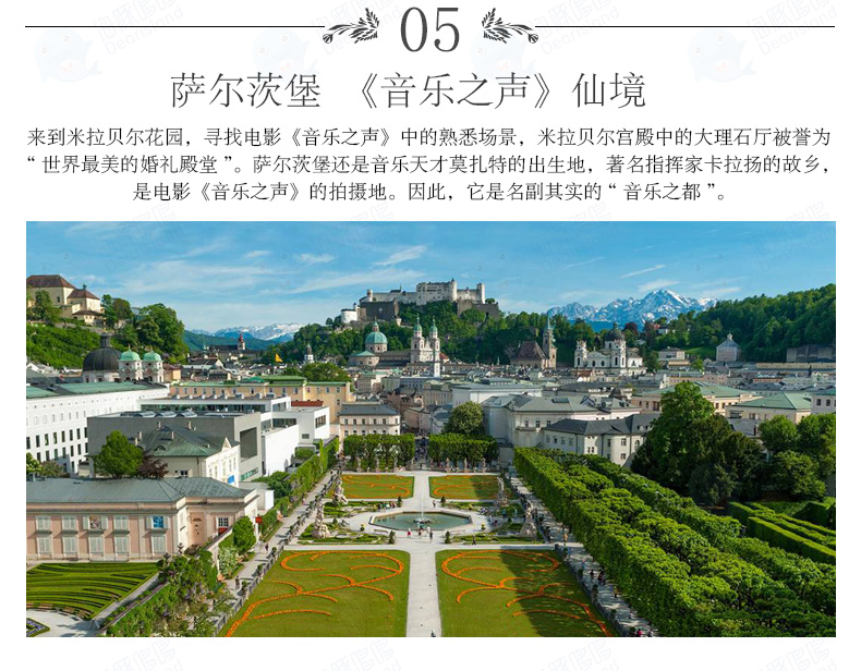 : 驱车前往★音乐之声仙境-萨尔茨堡。来到【米拉贝尔花园】,寻找电影《音乐之声》中的熟悉场景,米拉贝尔宫殿中的大理石厅被誉为“世界最美的婚礼殿堂”。萨尔茨堡还是音乐天才莫扎特的出生地,著名指挥家卡拉扬的故乡,是电影《音乐之声》的拍摄地。因此,它是名副其实的“音乐之都”。