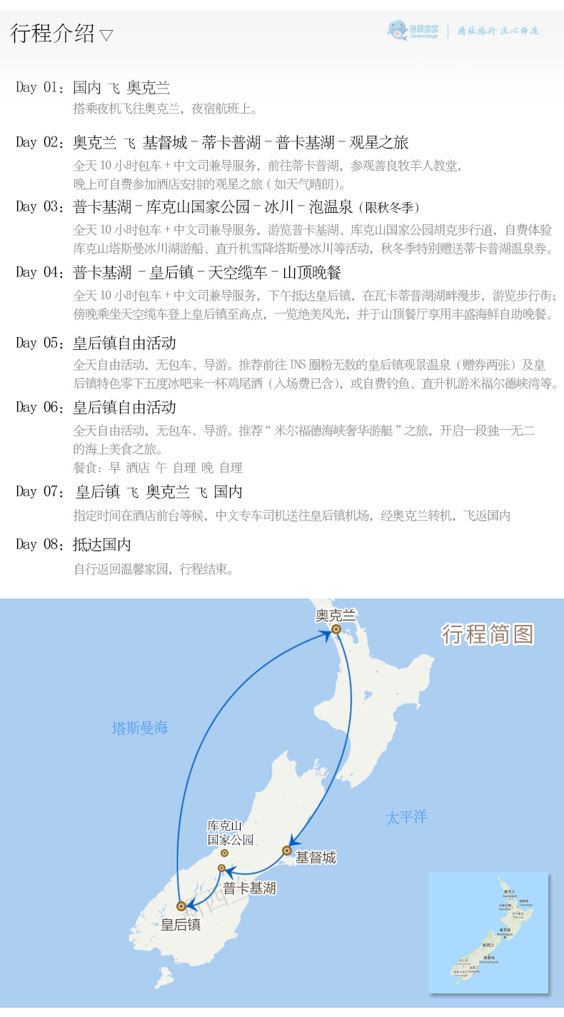 景点:普卡基湖、库克山国家公园胡克步行道,秋冬季特别赠送蒂卡普湖温泉券。