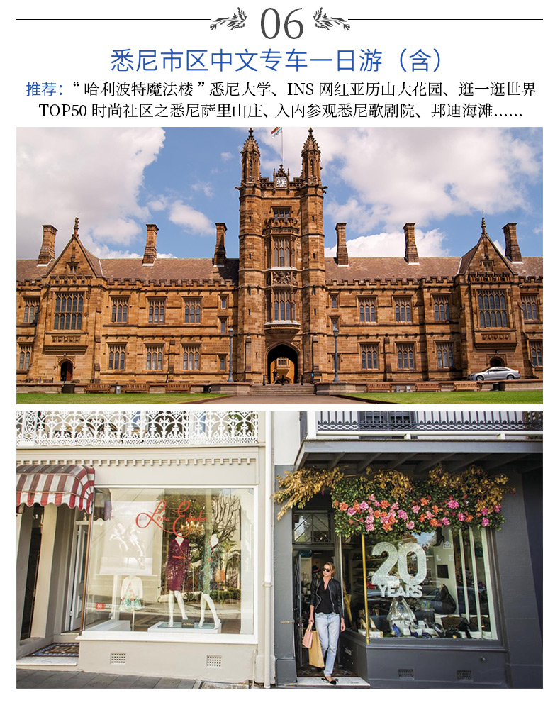 1.汉密尔顿岛直升机+游船巡礼心形礁含浮潜、半潜艇玻璃底船+水下观景室+自助午餐;2.白天堂含希尔湾游船一日游,含西式沙滩午餐;3.汉密尔顿岛野生动物园和考拉共进早餐+抱考拉照相;4.悉尼歌剧院入内参观品鉴之旅、悉尼大学参观;