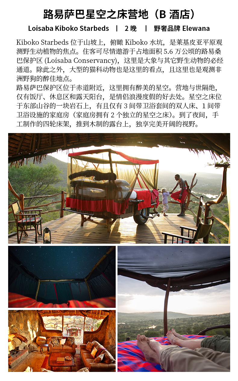 ●内罗毕1晚海明威酒店住宿●路易萨巴保护区2晚帐篷营地或星空之床酒●马赛马拉国家公园3晚顶奢酒店SanctuaryOlonana