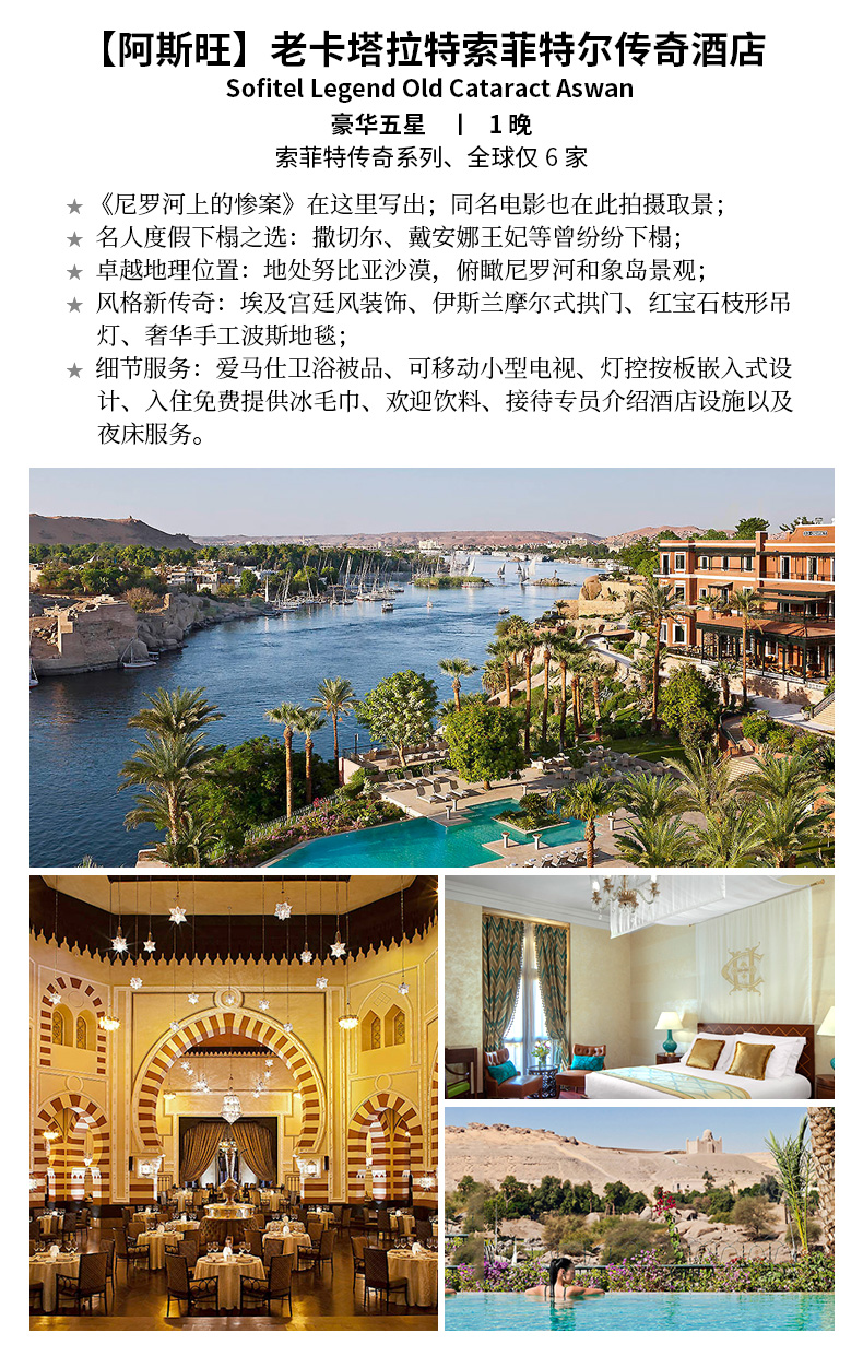 开罗MenaHouse五星或同级酒店住宿含早餐,1晚开罗FourSeasonsCairoAtTheFirstResidence五星或同级酒店住宿含早餐,2晚阿斯旺LegendOldCataract五星或同级酒店住宿含早餐,1晚阿斯旺/卢克索TRAVCOTELs五星或同级游轮住宿(高层舱)含三餐,3晚